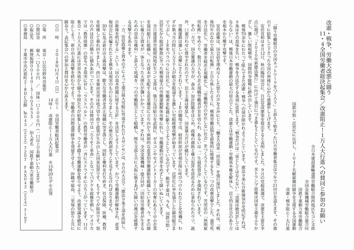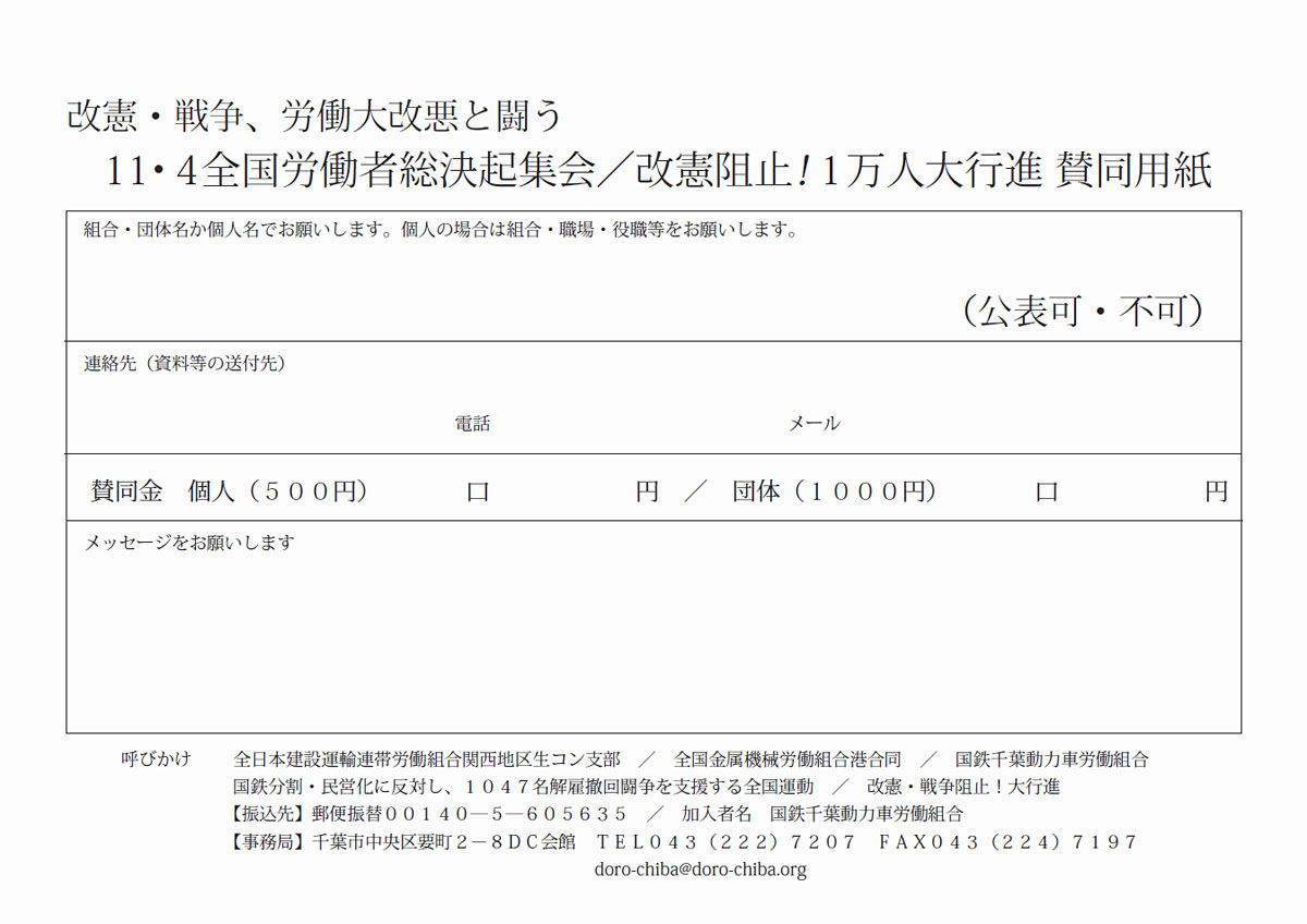〒260-0017千葉市中央区要町2-8 動労千葉気付 TEL.0432227207