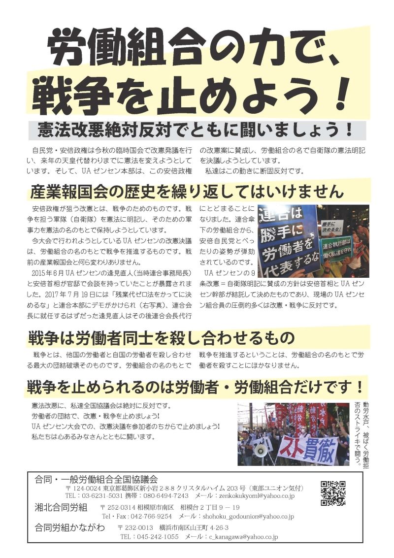 ●「自衛隊」「緊急事態」明記の憲法改悪によって、日本は戦争をする国に根本から変わります。私たちはそのような改憲案の国会発議に反対します。