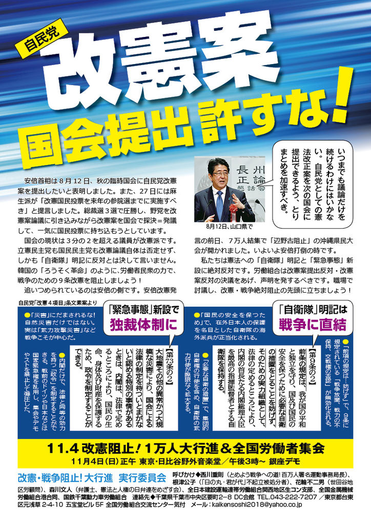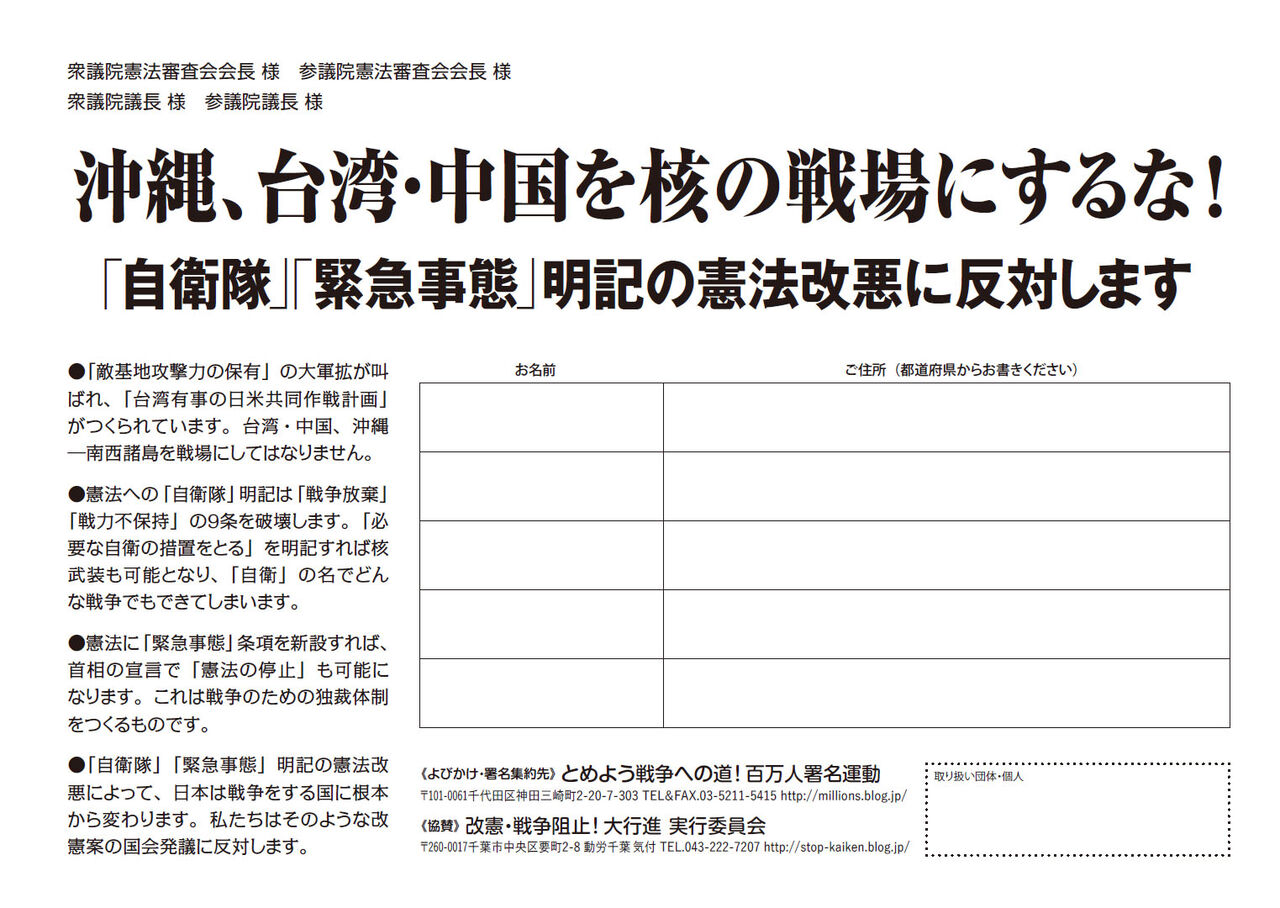 ●「自衛隊」「緊急事態」明記の憲法改悪によって、日本は戦争をする国に根本から変わります。私たちはそのような改憲案の国会発議に反対します。