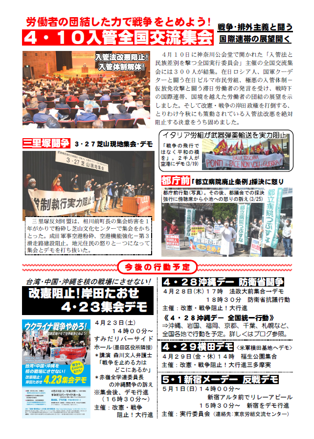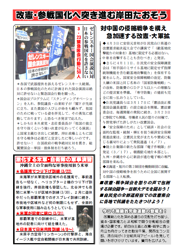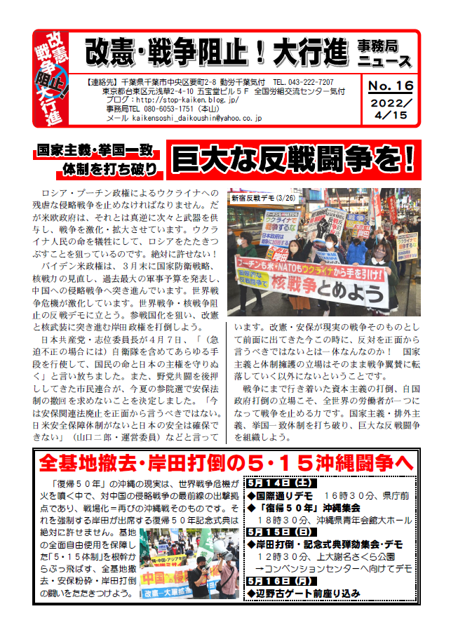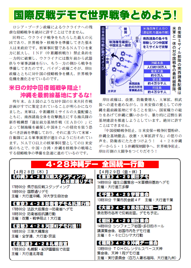 改憲・戦争阻止!大行進は、4・28全国統一行動を闘います。戦争下の今、全国で安保粉砕・沖縄全基地撤去の声をあげよう。