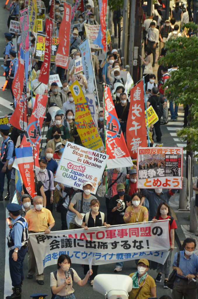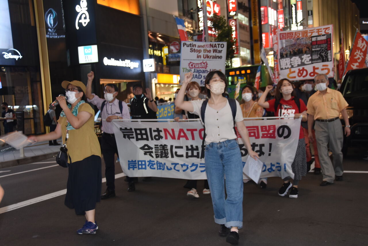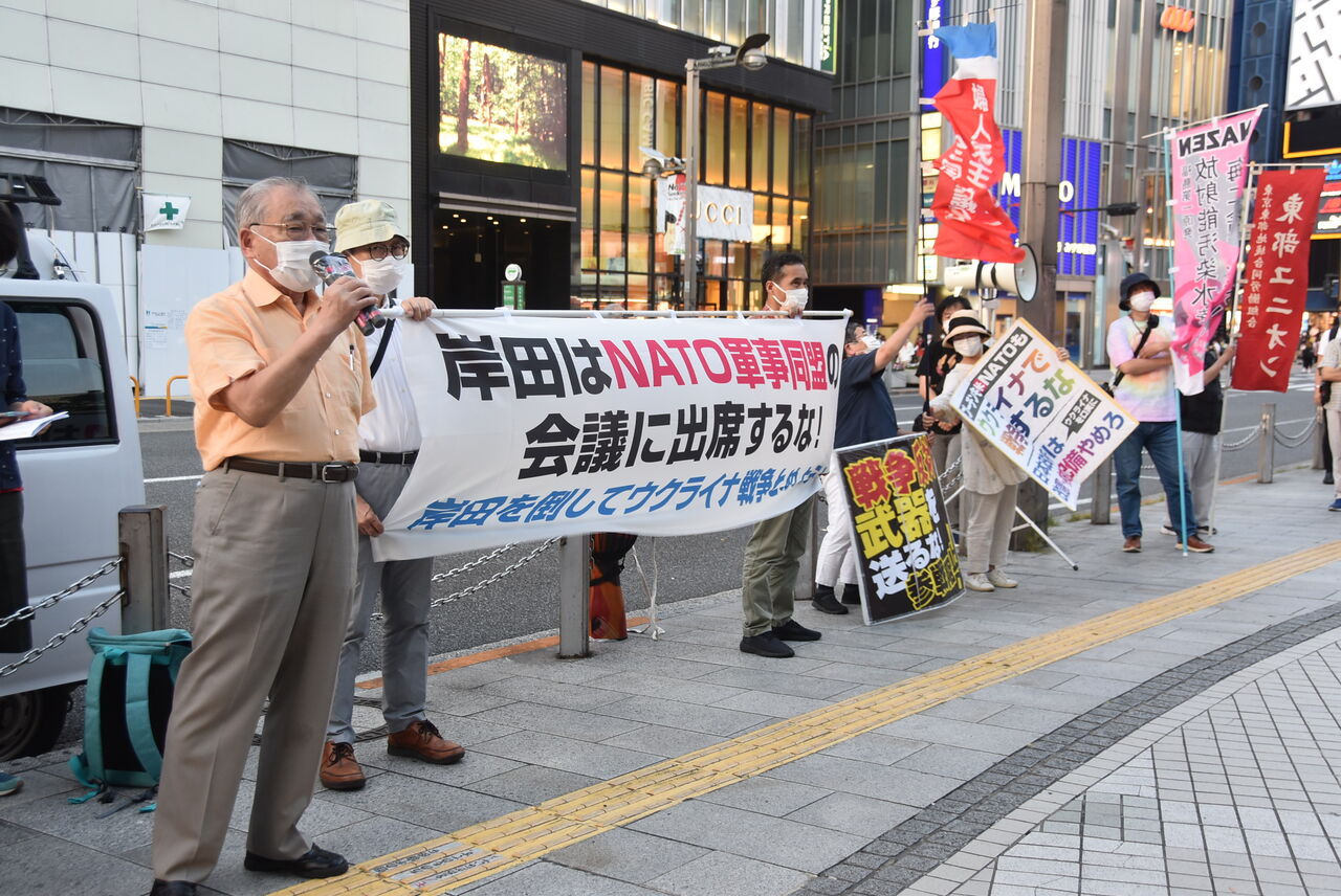 ウクライナ戦争が始まって4カ月が過ぎました。アメリカやNATOはウクライナにバンバン武器を送って、泥沼化させています。戦争を止める気なんてないどころか、むしろ軍需産業がこの戦争でぼろ儲けしてる。本当に腐ってる! しかも戦場に行くのはあいつらじゃない。殺し合わされるのは労働者民衆です。こういう連中が明日、NATOの首脳会議をやる。それに岸田が参加するということは、日本が参戦国として名乗りを上げるということです。絶対に許せない。