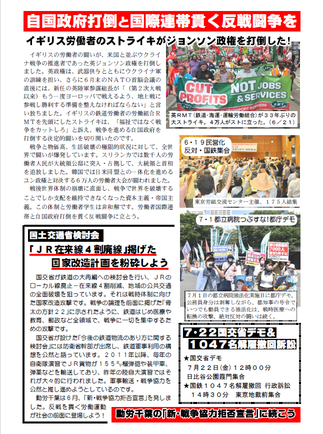 国防-安全保障政策を競い合い、改憲・大軍拡の大合唱となっている参院選の真っ只中で、同時に戦争と生活破壊への労働者人民のわき上がる怒りの先頭に立って、デモを闘い抜きました。戦争絶対反対、岸田打倒の訴えとデモに、街頭の圧倒的注目と合流(多くの飛び入り)がありました。