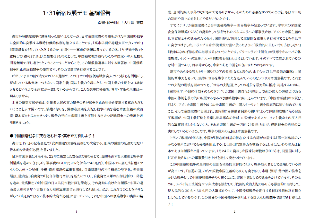 アメリカ帝国主義・トランプ政権の国家安全保障戦略(NSS)-国家防衛戦略(NDS)とその全面的発動、そのもとで高市が中国侵略戦争のための戦時独裁体制確立のために踏み切った解散総選挙攻撃と真っ向対決し、米日の中国侵略戦争阻止こそ総選挙をめぐる核心的対決点であり、労働者人民の実力闘争-反戦デモが社会変革の力であることを鮮明にさせた。