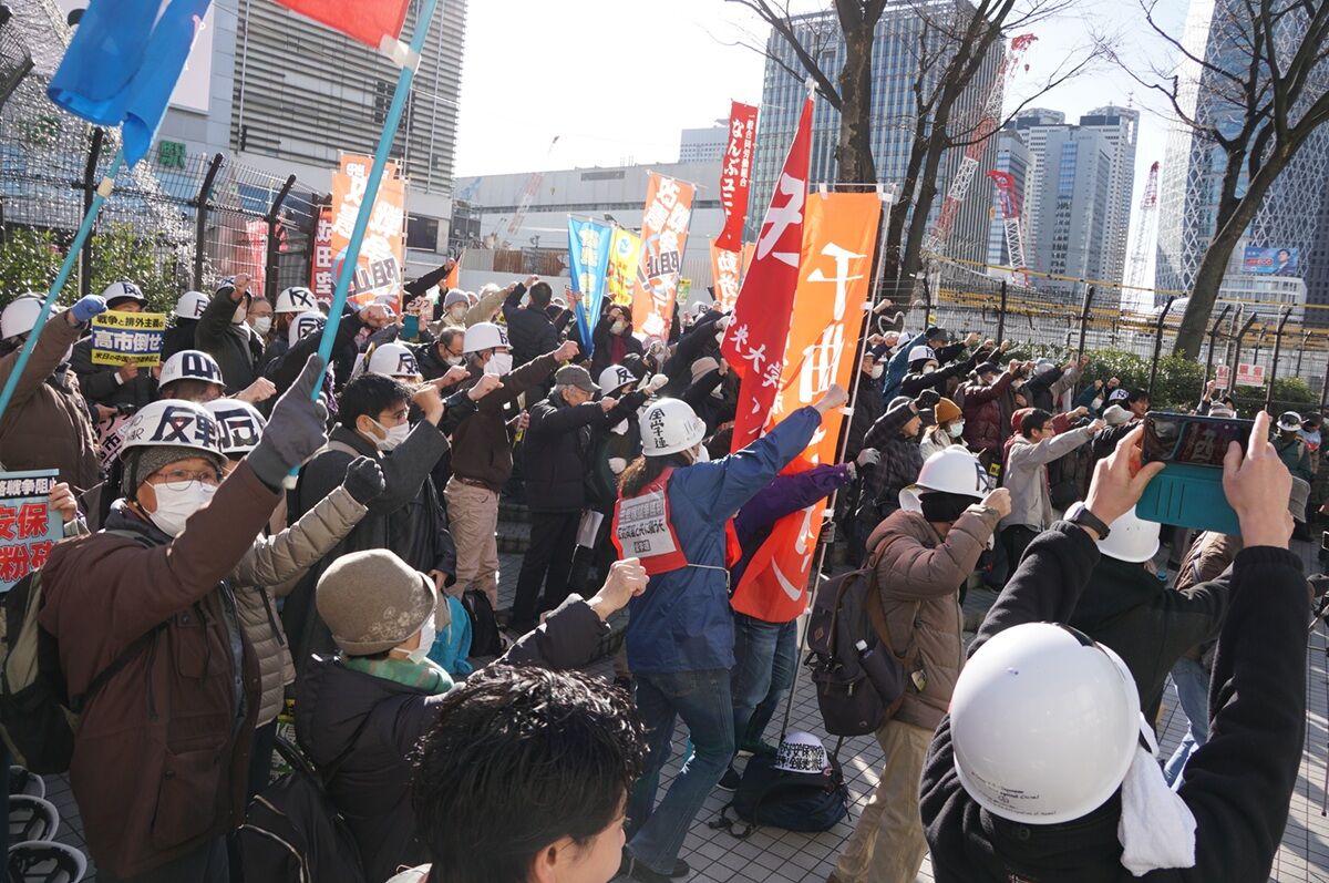 ヘルメット部隊のスクラムデモを先頭に新宿駅を1周するデモ