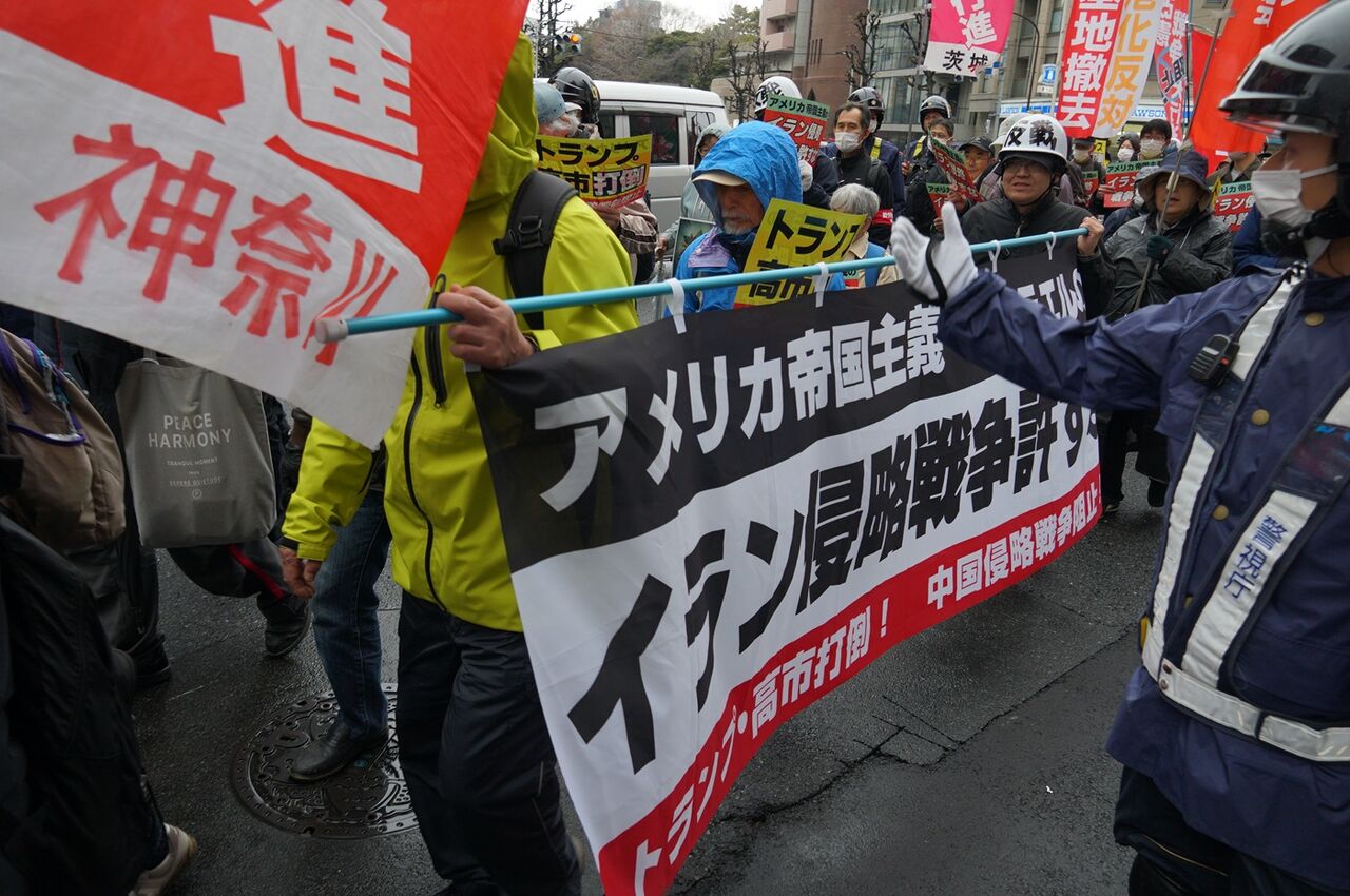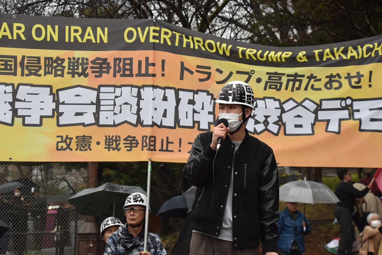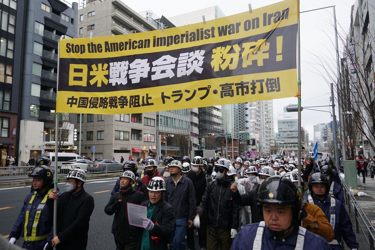 不正義極まるイラン侵略戦争をやっているトランプを、高市が「平和と繁栄をもたらせるのはドナルドだけだ」と称賛した、この許しがたい日米首脳会談=戦争会談を徹底的に弾劾し粉砕する戦闘的デモを打ち抜いた。