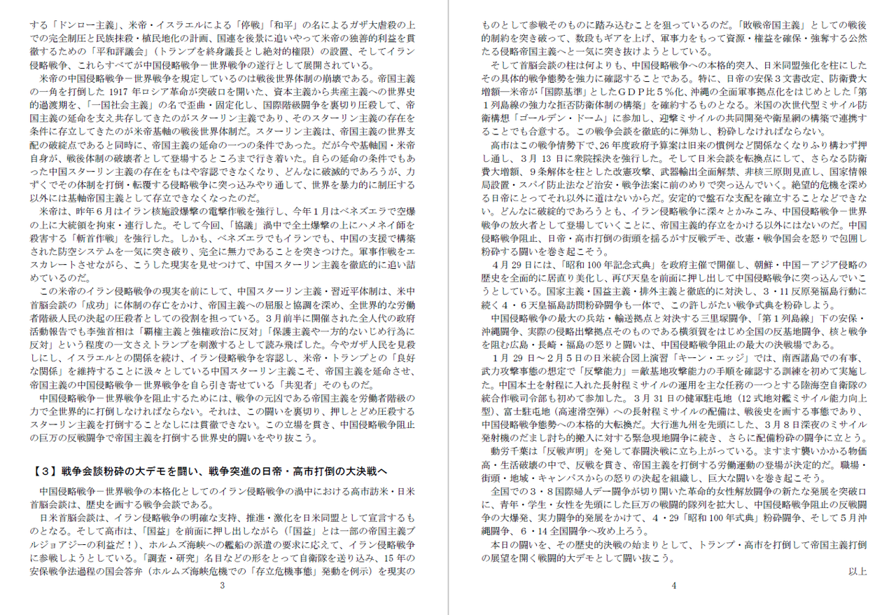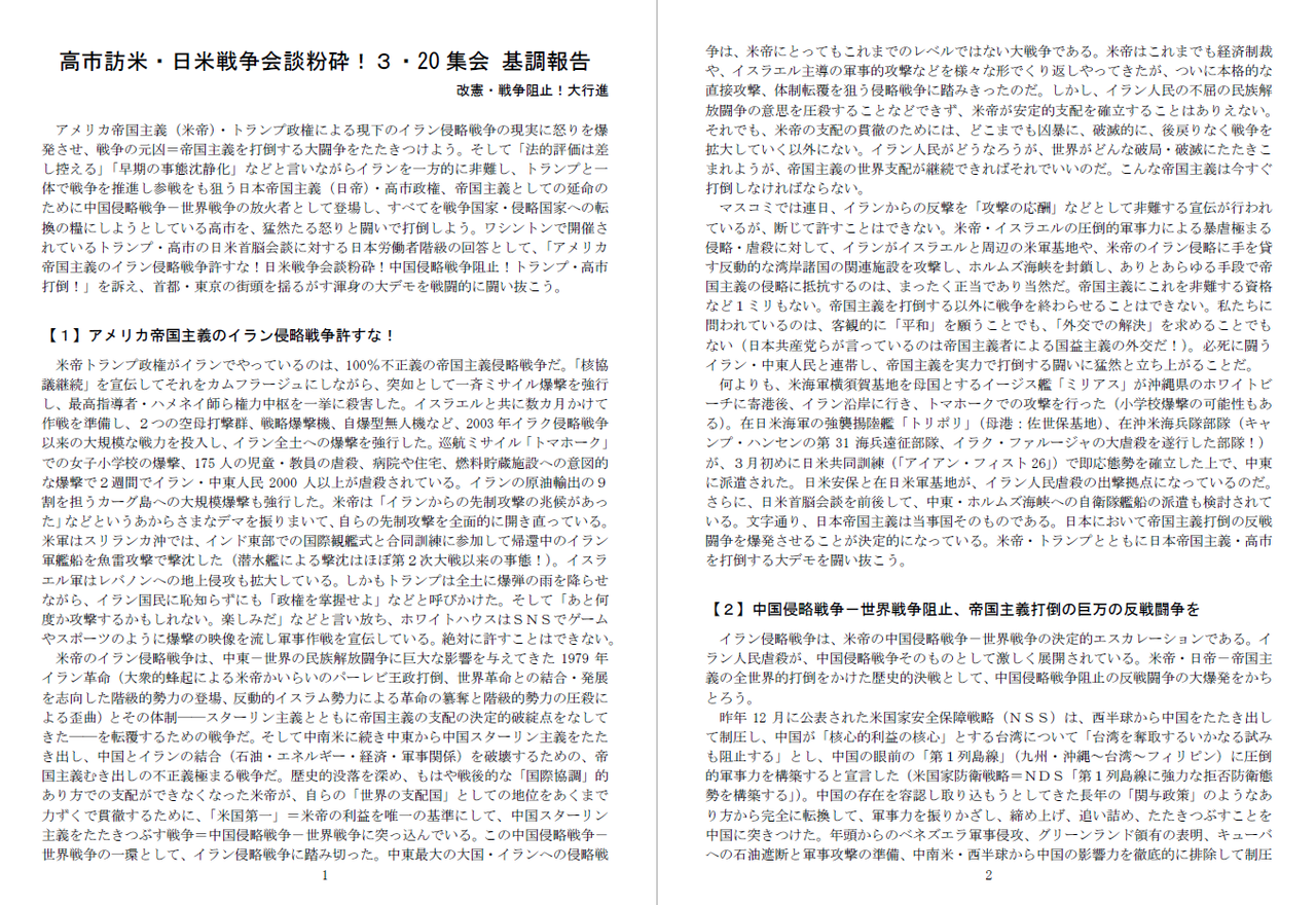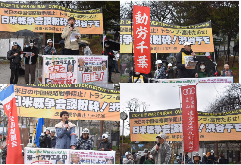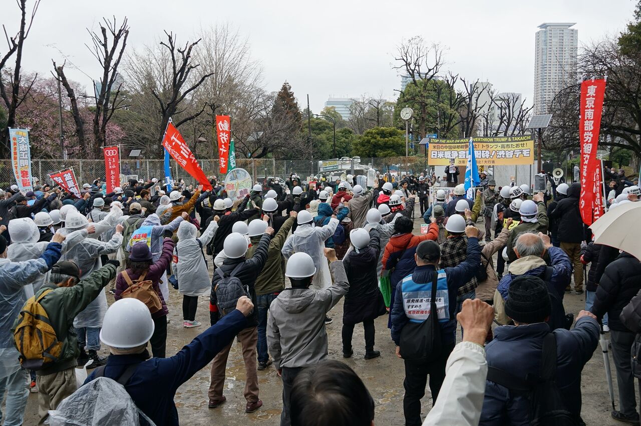 不正義極まるイラン侵略戦争をやっているトランプを、高市が「平和と繁栄をもたらせるのはドナルドだけだ」と称賛した、この許しがたい日米首脳会談=戦争会談を徹底的に弾劾し粉砕する戦闘的デモを打ち抜いた。